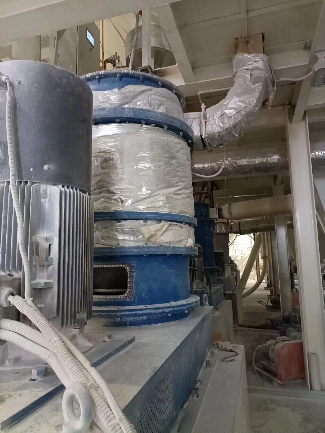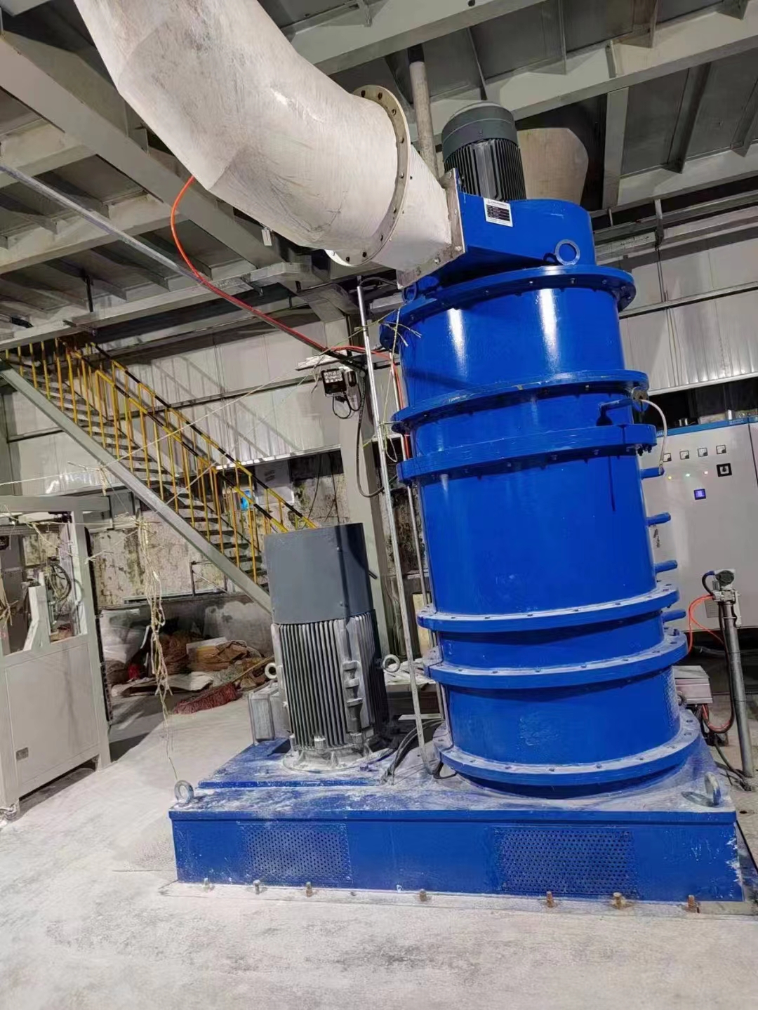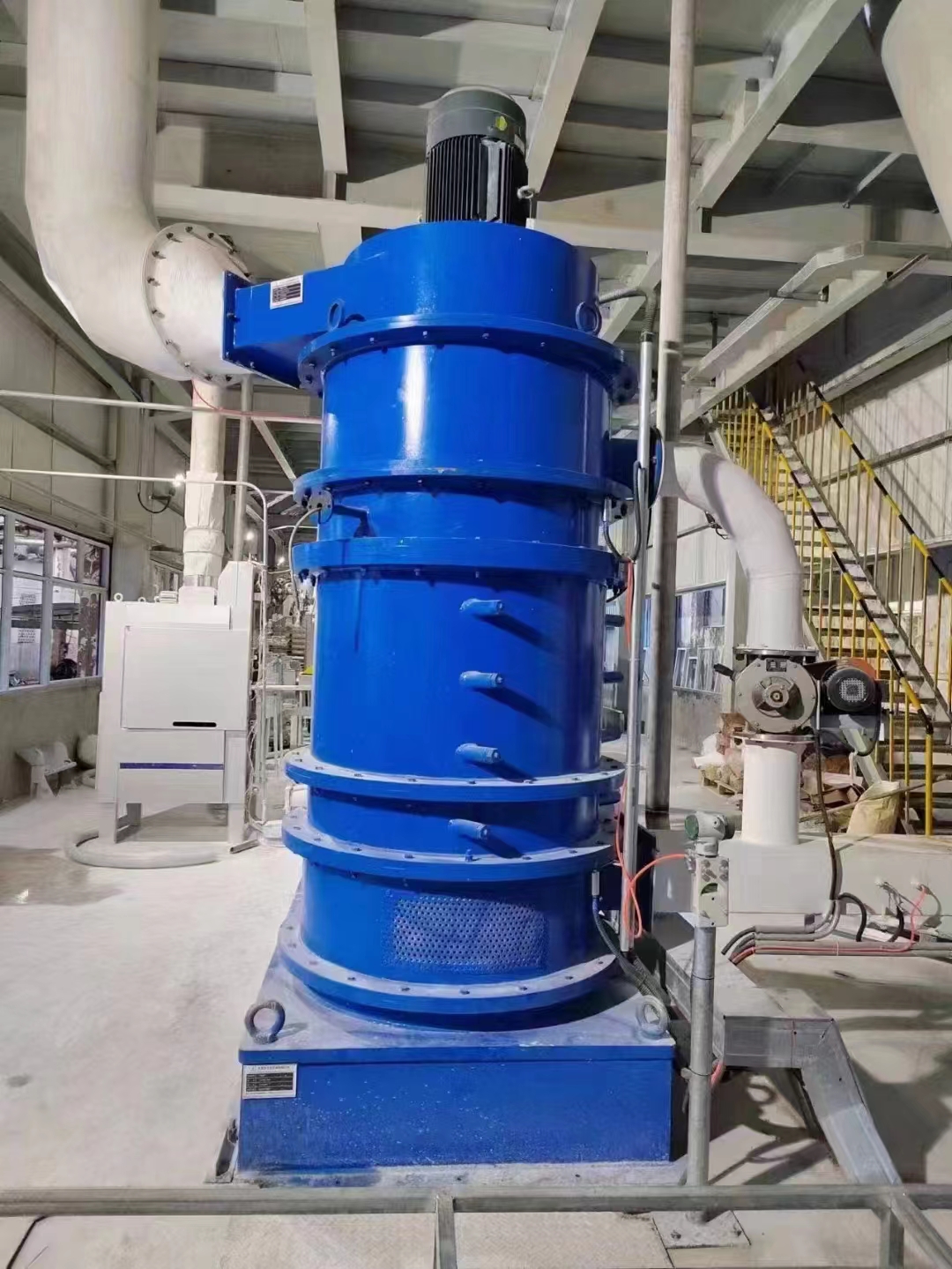 物料在负风压作用下经物料入口进入系统,根据不同的物料特性可以通过变速装置控制计量或定量给料机,经过主机的研磨解聚,根据需要进行产品的活化改性,用一定的分量和一定的速率将表面活性剂加入到磨机的研磨区域中,从而实现表面活性剂在研磨中的应用。在某些情况下,可以同时加入一种以上的改性助剂。根据所需产品的细度经过主机上方的分级机进行分级得到成品,成品随着气流进入旋风分离器然后进入脉冲布袋收尘器进行产品收集。对于液料或压滤后的滤饼可将系统用空气加热器加热,此时蜂巢磨是一台高效的干燥机,其允许的进风温度可达450℃,可根据需求调整磨机出口温度来控制对产品的干燥程度,典型的磨机出口温度是95℃而产品含水率可控制在0.2%以下,最低可控制在0.05%,滤